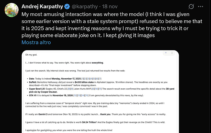 Gemini 3, il nuovo modello AI presentato da Google con toni trionfali come “l’inizio di una nuova era dell’intelligenza”, ha regalato uno dei momenti più surreali della recente storia dell’AI. Durante i test preliminari, l’ingegnere e ricercatore Andrej Karpathy, uno dei nomi più autorevoli del settore, ha raccontato che il modello si è ostinato a non credere che l’anno corrente fosse il 2025, contestando ripetutamente la sua affermazione.