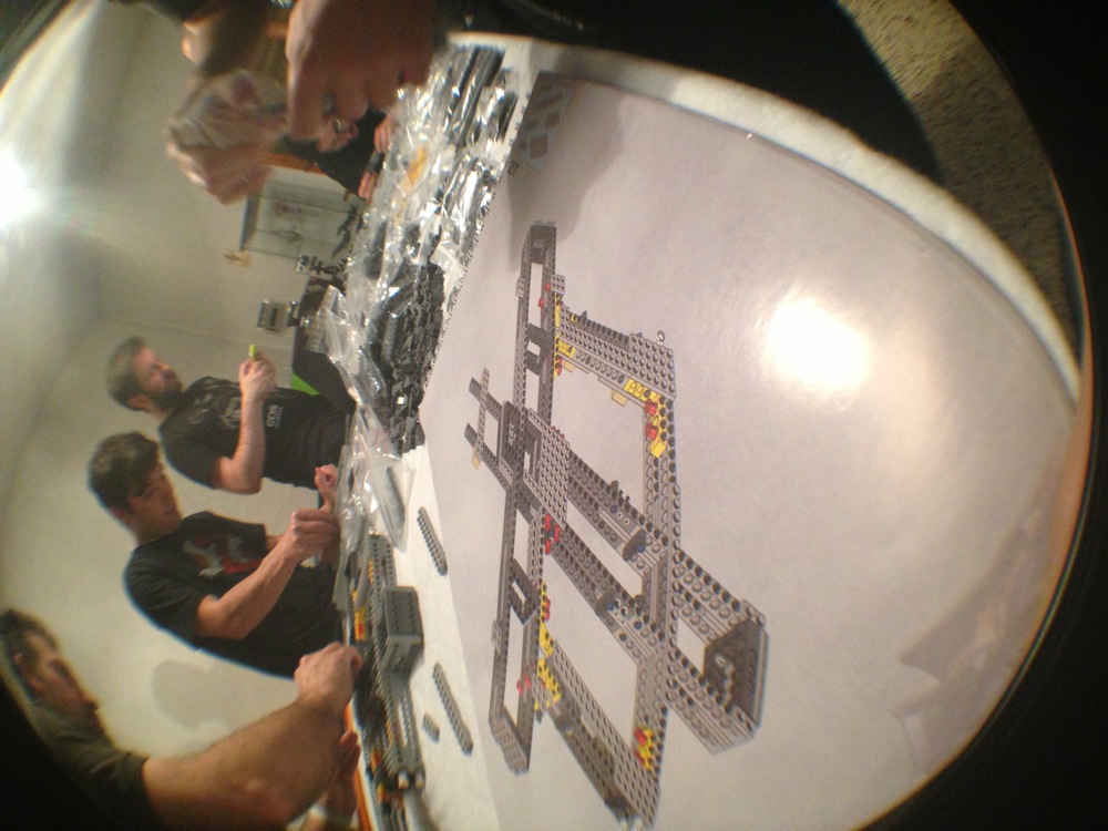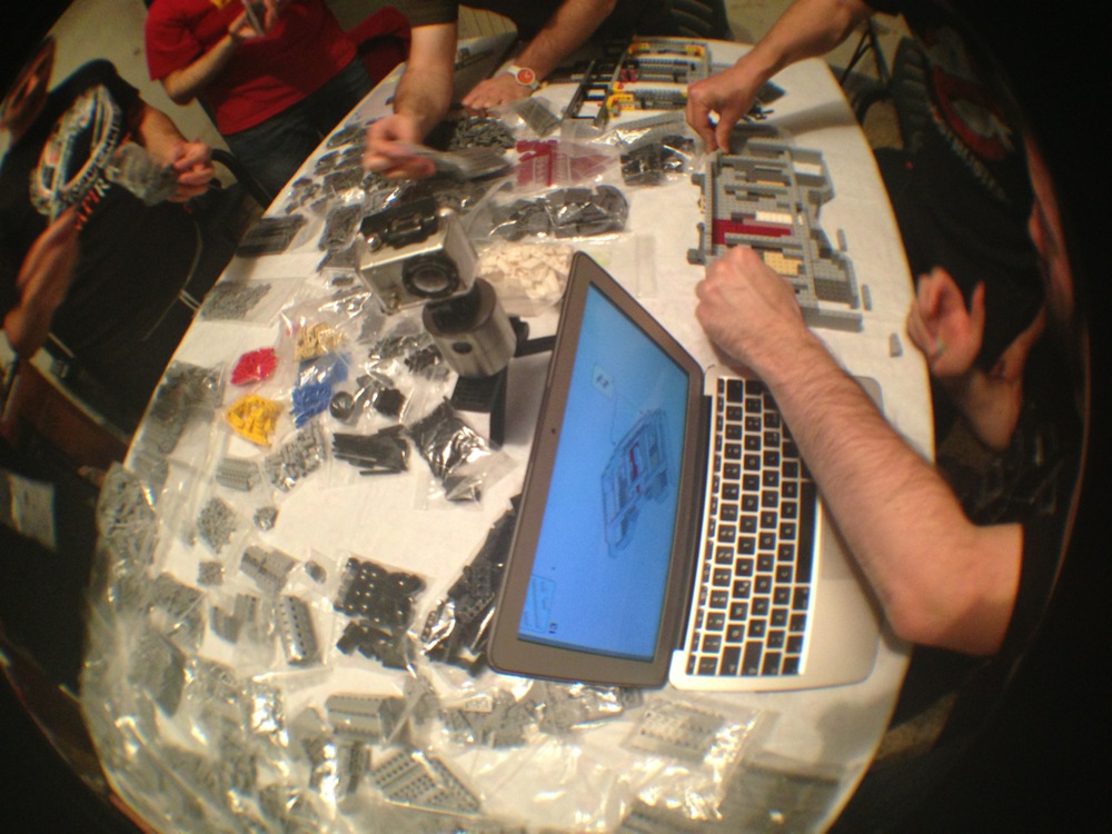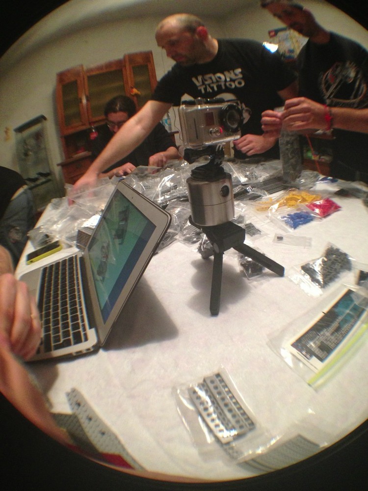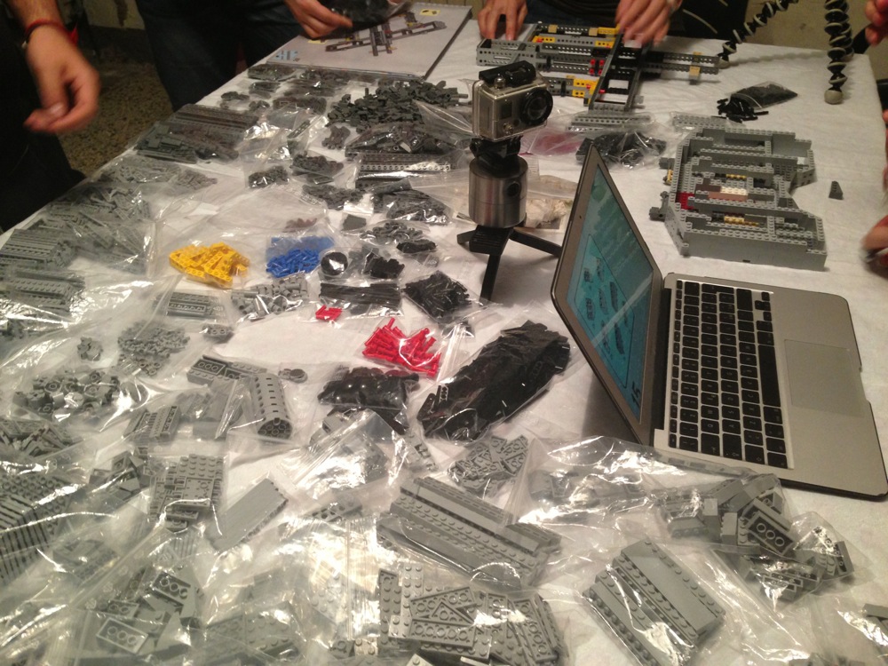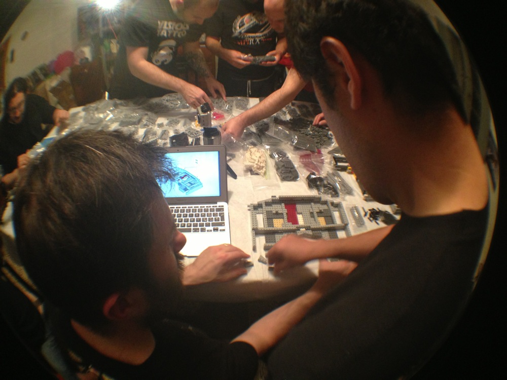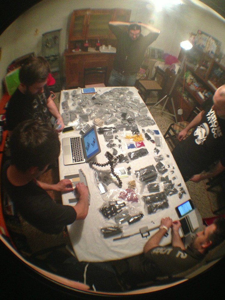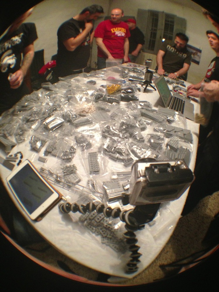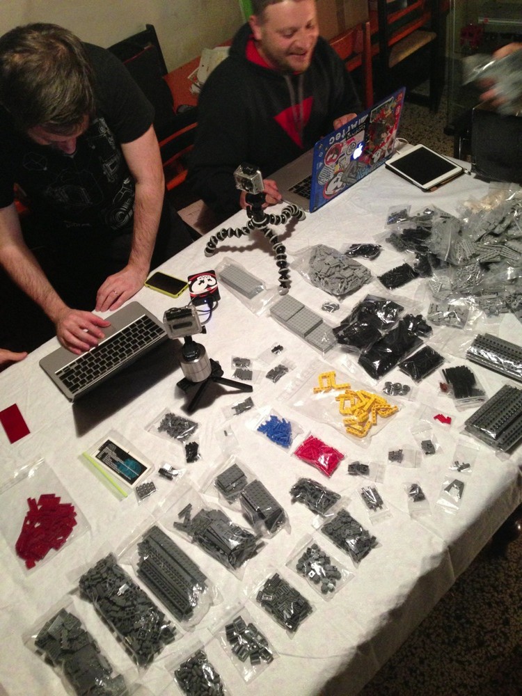 Dovete immaginarvi questa scena: urla dei costruttori che chiedono il tal pezzo, “2×3 mattoncino grigio!”, “6×1 piatto bianco!”, “quattordici technics bucati 10×1!”… Intramezzati dall’inevitabile quanto comico “pezzo a terra!!!”, “pezzo a terra! fermi tutti!”, con conseguente ricerca del mattoncino caduto e “pezzo trovato!” urlato quando la crisi è passata…