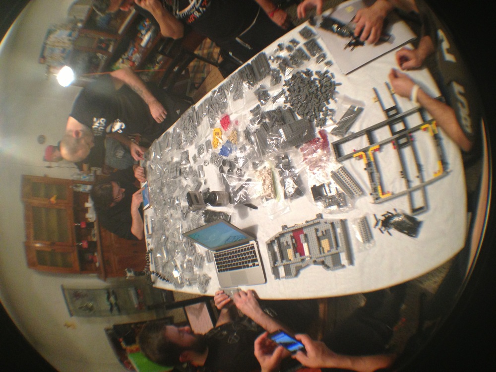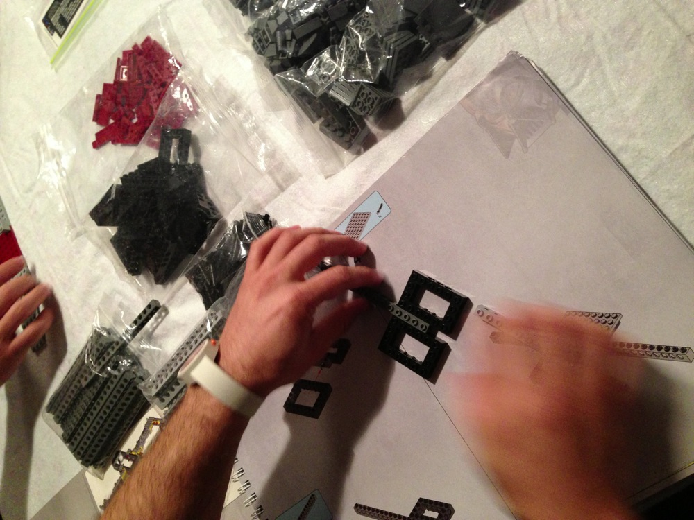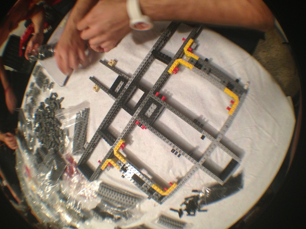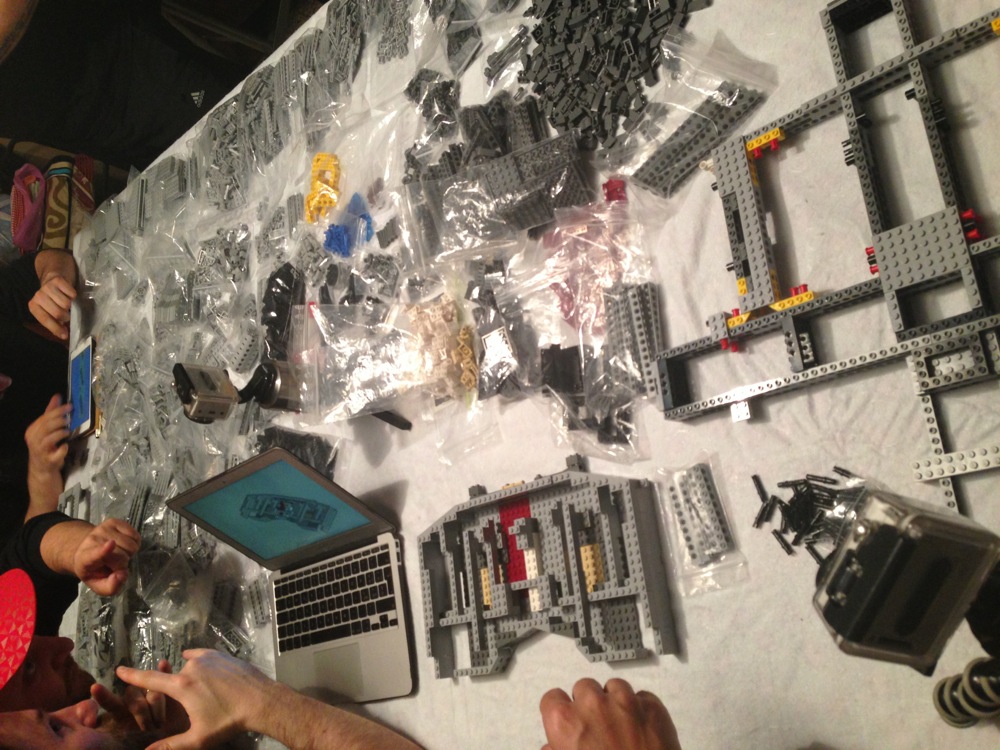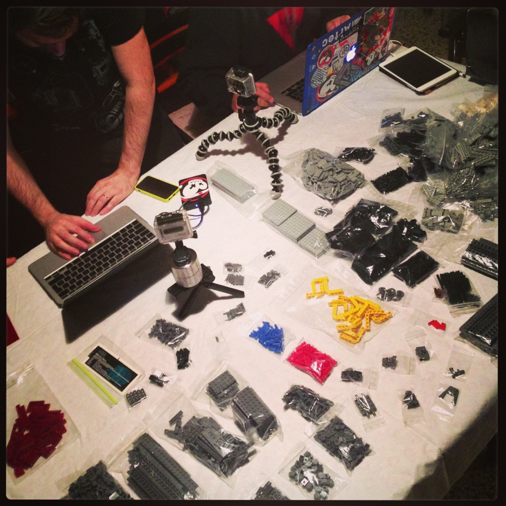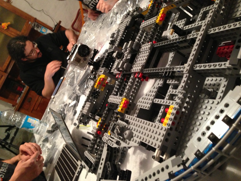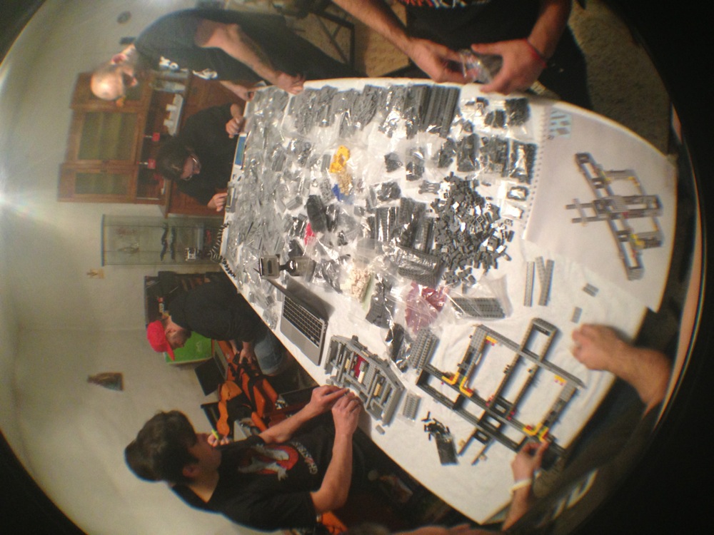 Dovete immaginarvi questa scena: urla dei costruttori che chiedono il tal pezzo, “2×3 mattoncino grigio!”, “6×1 piatto bianco!”, “quattordici technics bucati 10×1!”… Intramezzati dall’inevitabile quanto comico “pezzo a terra!!!”, “pezzo a terra! fermi tutti!”, con conseguente ricerca del mattoncino caduto e “pezzo trovato!” urlato quando la crisi è passata…