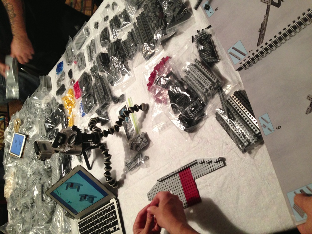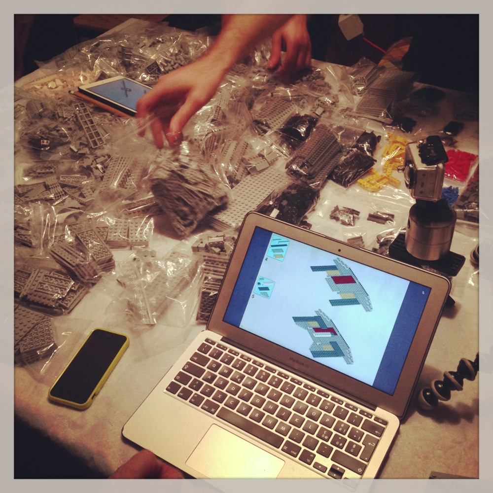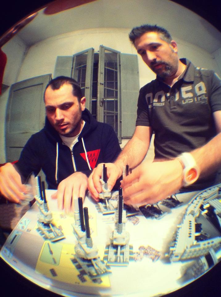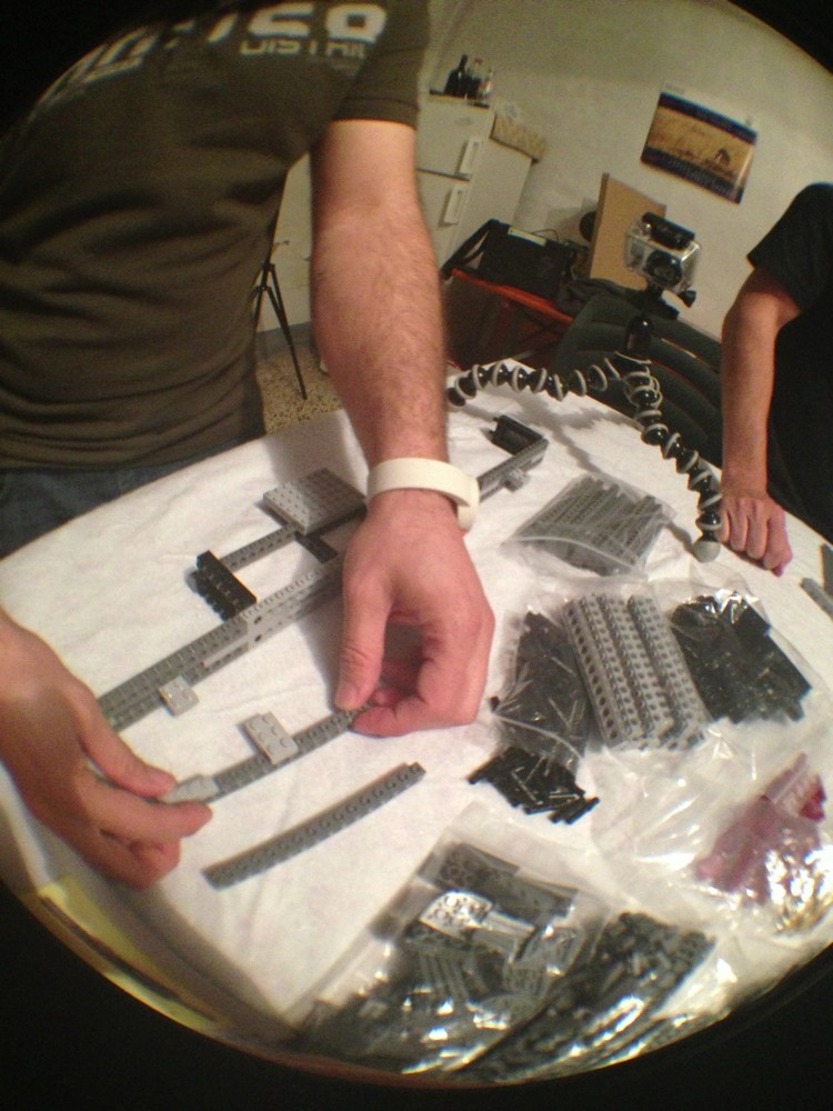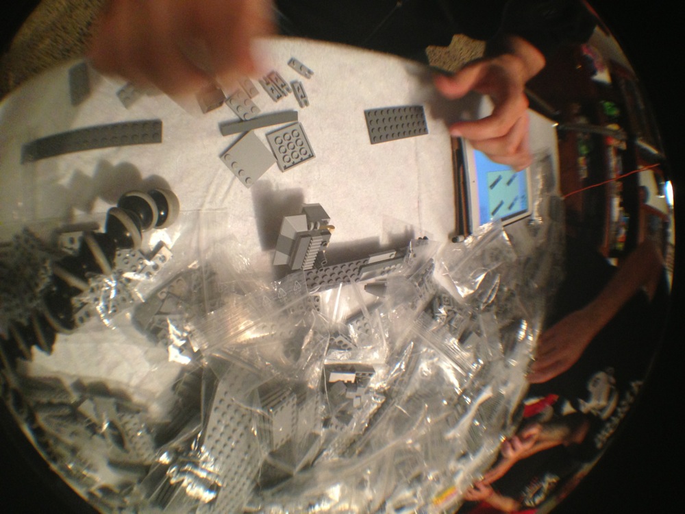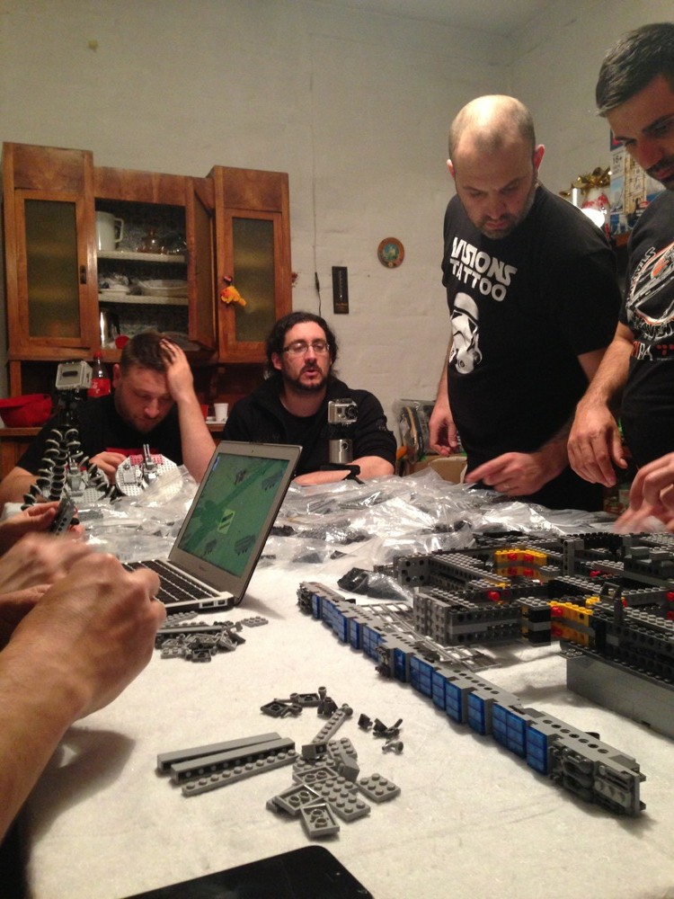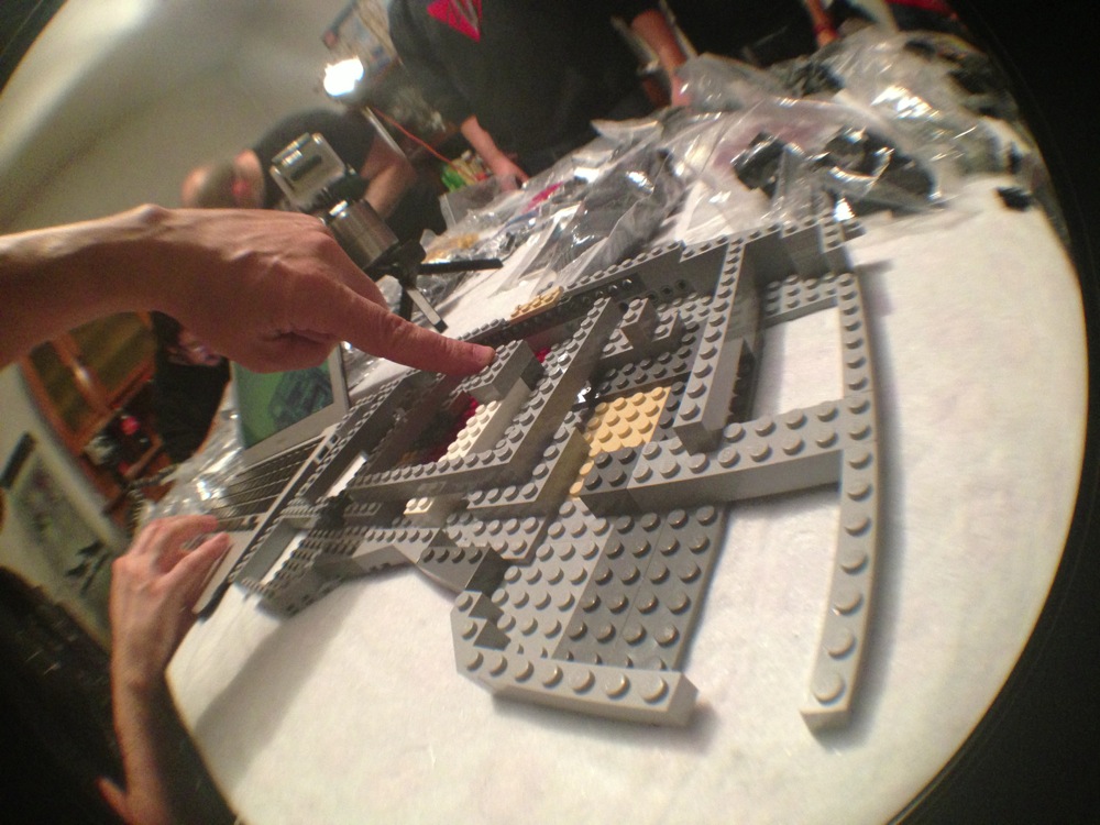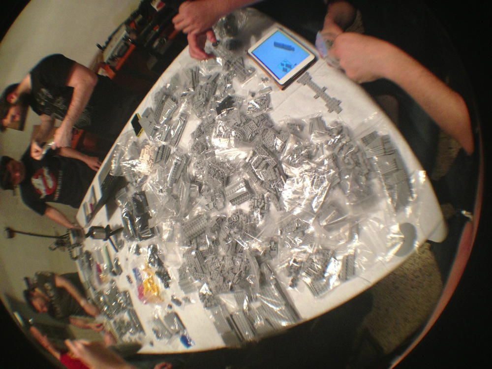 Dovete immaginarvi questa scena: urla dei costruttori che chiedono il tal pezzo, “2×3 mattoncino grigio!”, “6×1 piatto bianco!”, “quattordici technics bucati 10×1!”… Intramezzati dall’inevitabile quanto comico “pezzo a terra!!!”, “pezzo a terra! fermi tutti!”, con conseguente ricerca del mattoncino caduto e “pezzo trovato!” urlato quando la crisi è passata…