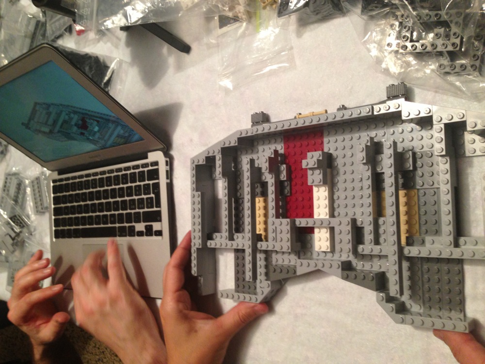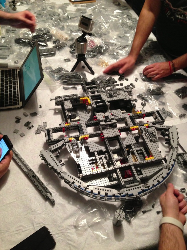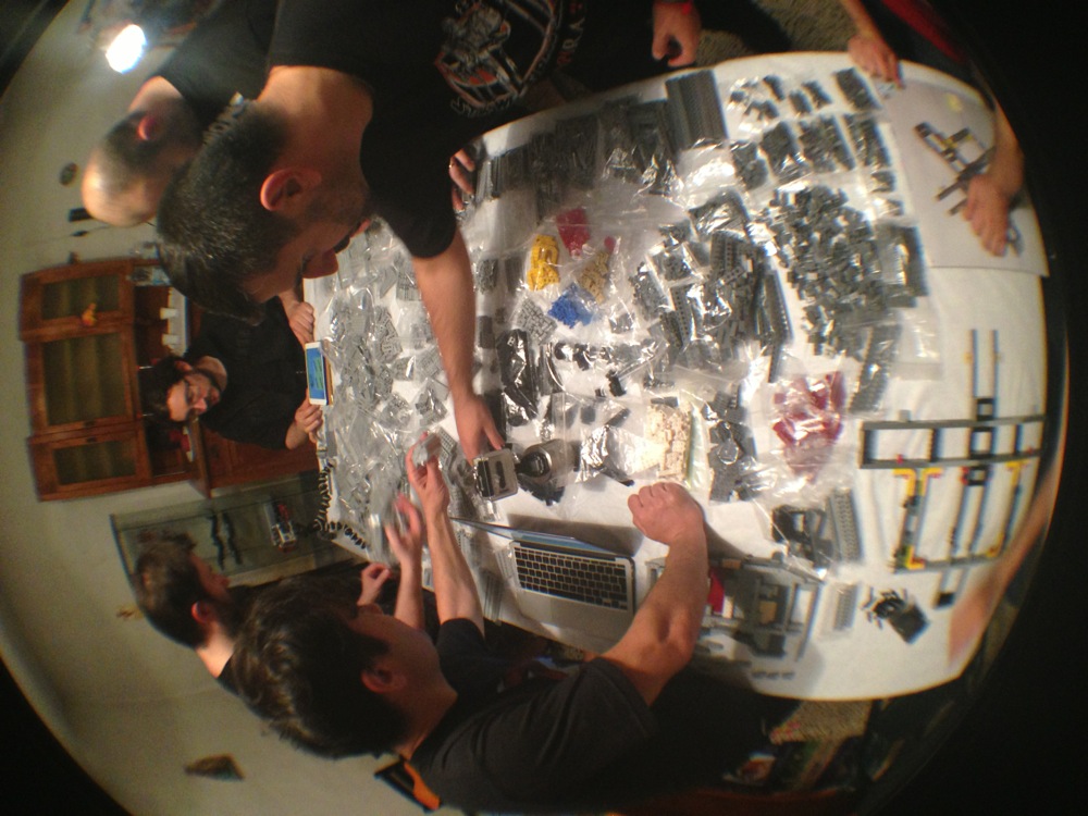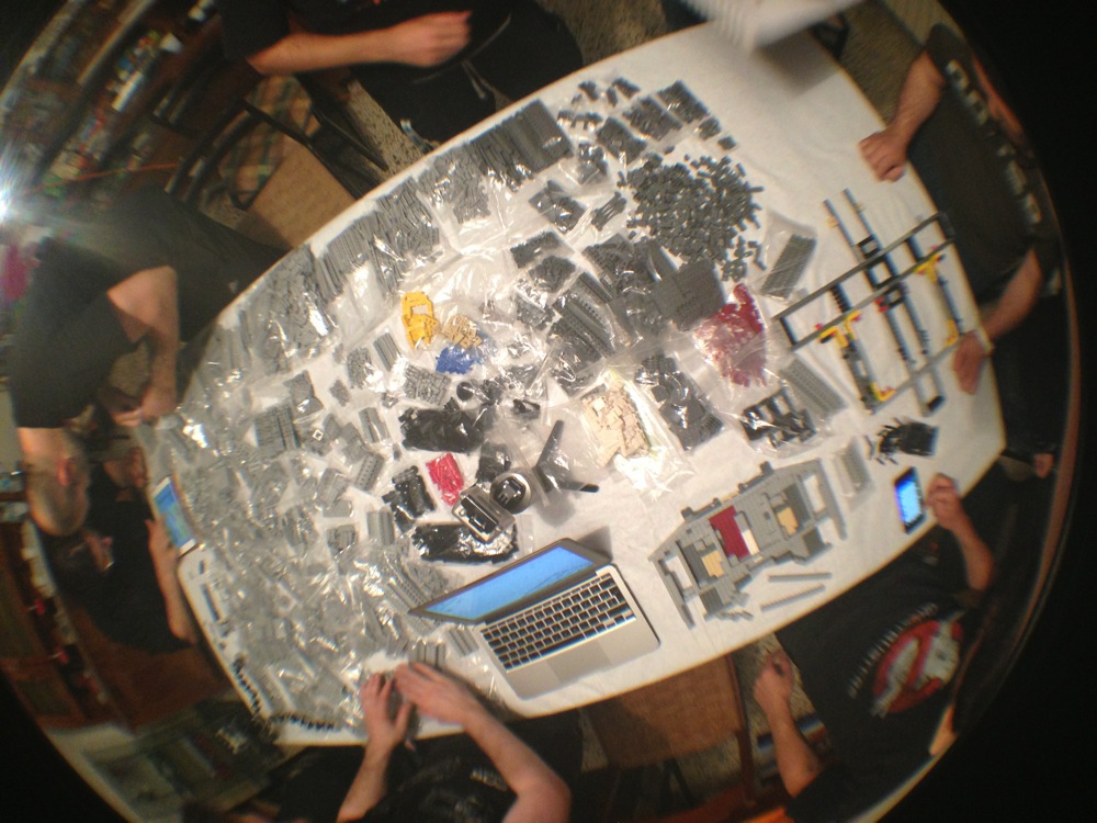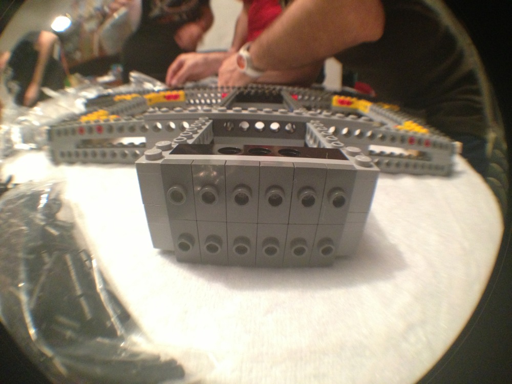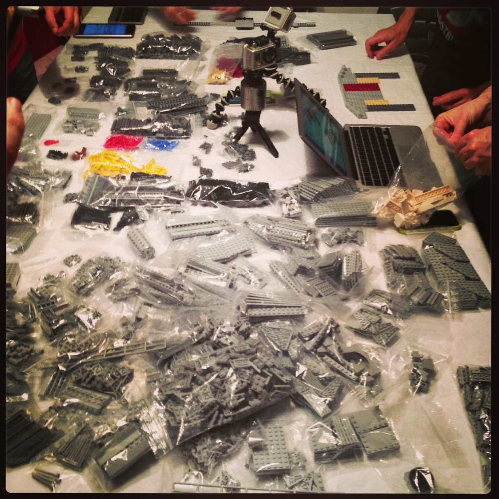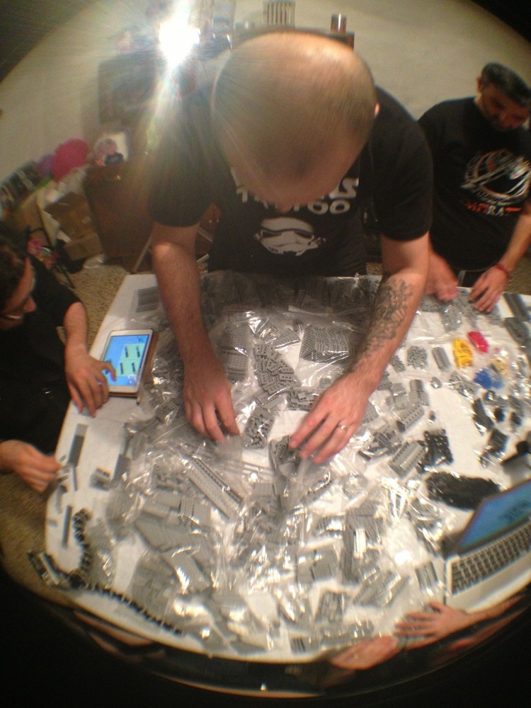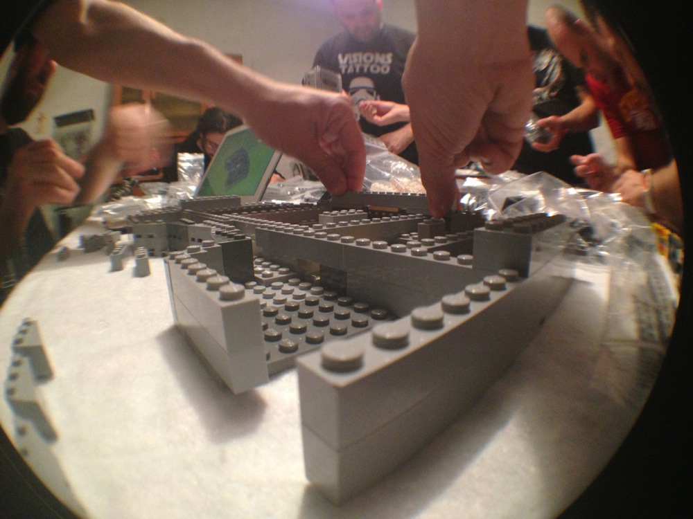 Dovete immaginarvi questa scena: urla dei costruttori che chiedono il tal pezzo, “2×3 mattoncino grigio!”, “6×1 piatto bianco!”, “quattordici technics bucati 10×1!”… Intramezzati dall’inevitabile quanto comico “pezzo a terra!!!”, “pezzo a terra! fermi tutti!”, con conseguente ricerca del mattoncino caduto e “pezzo trovato!” urlato quando la crisi è passata…