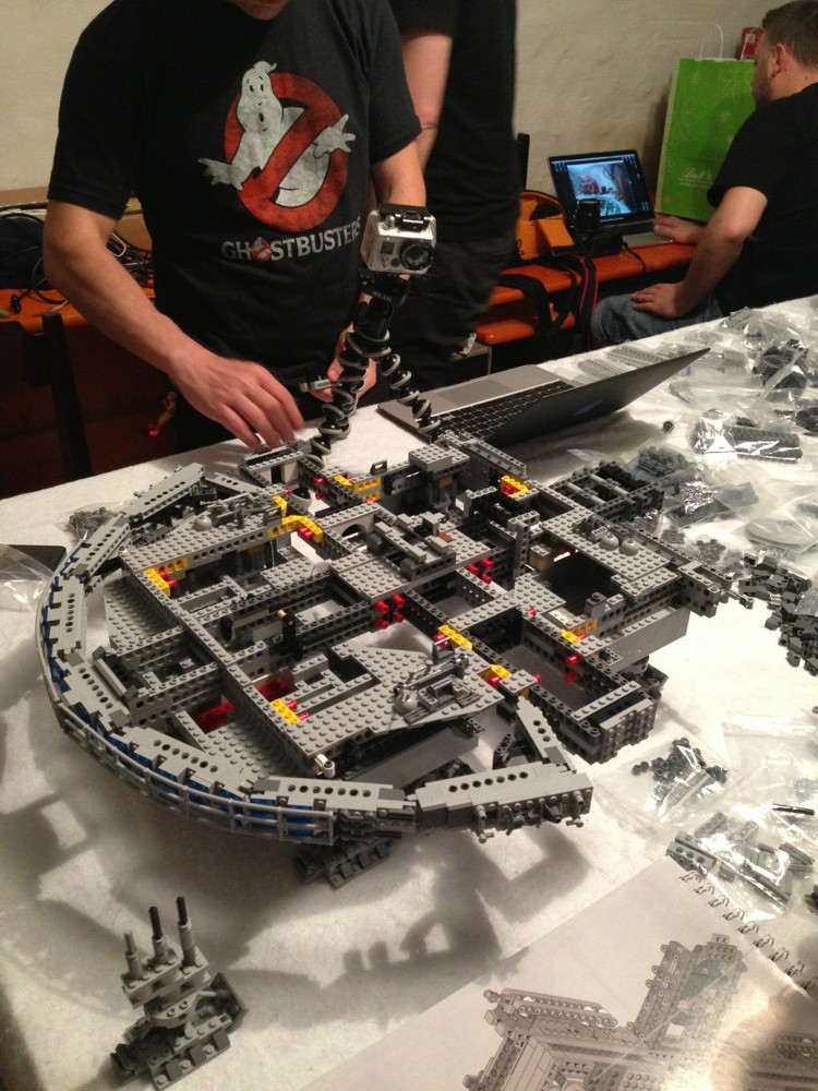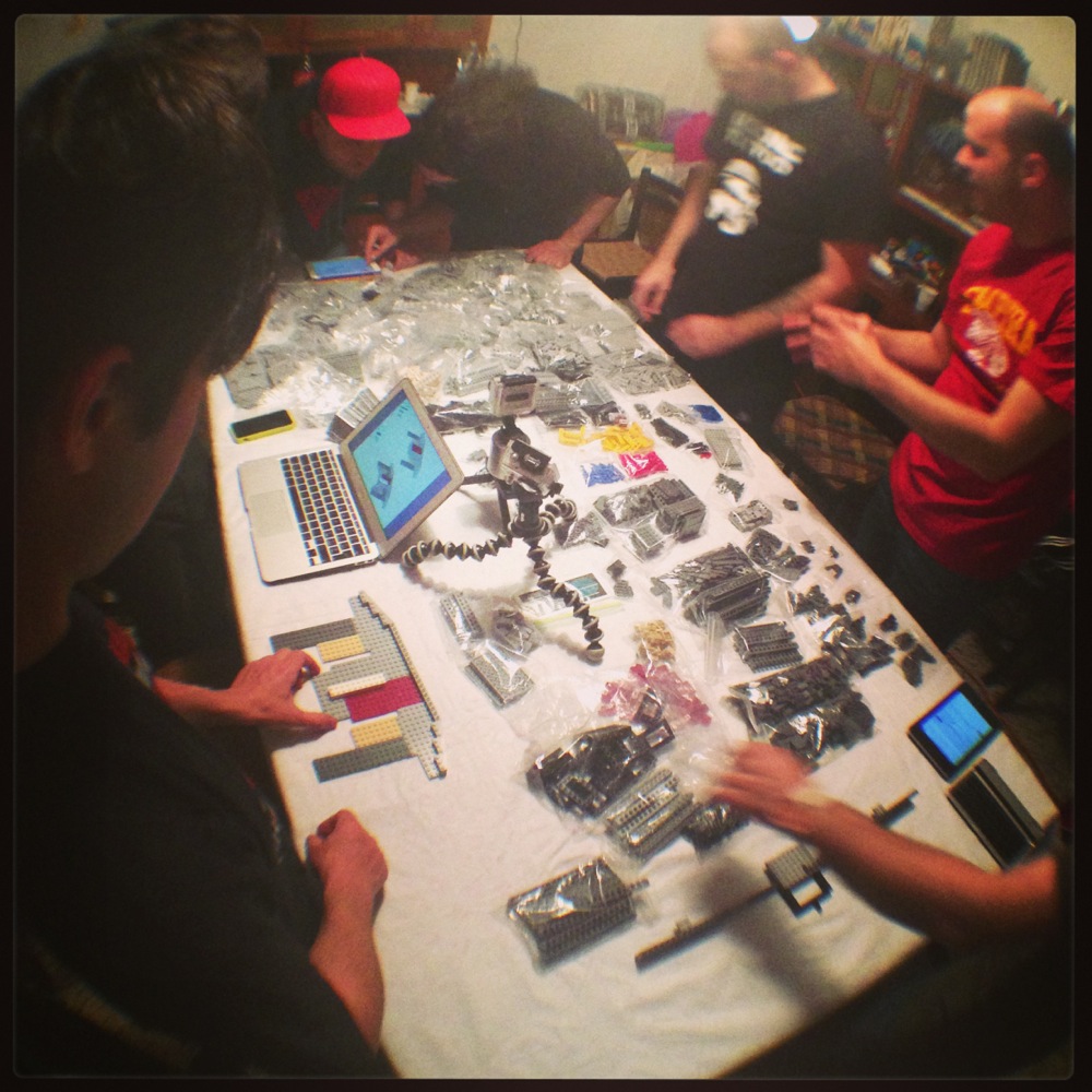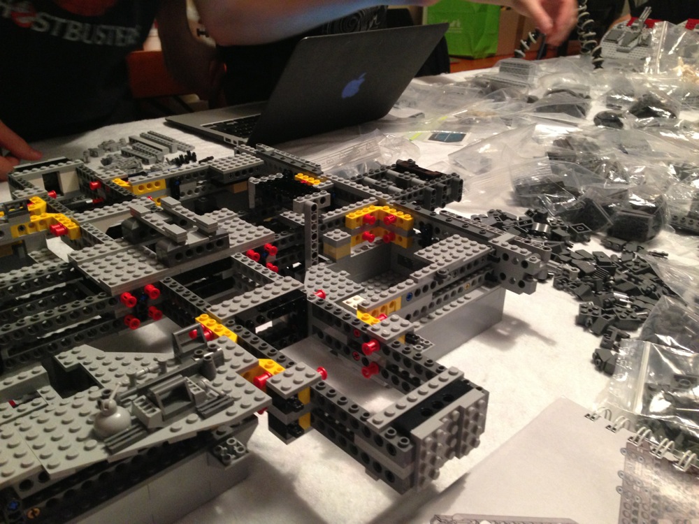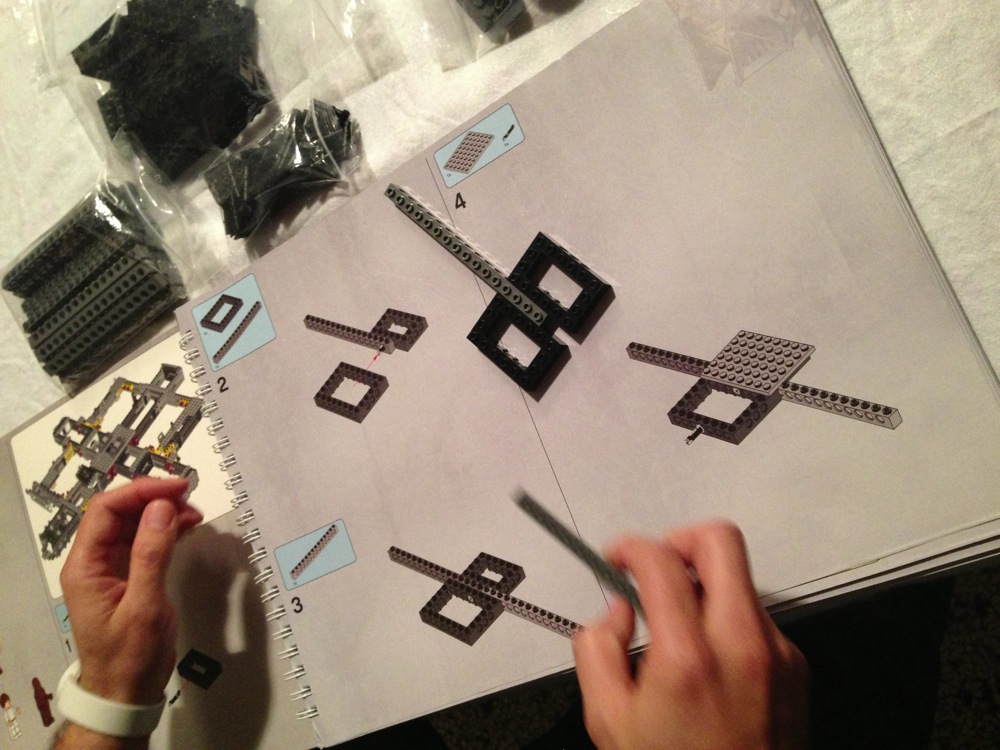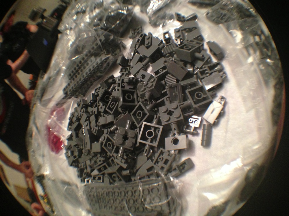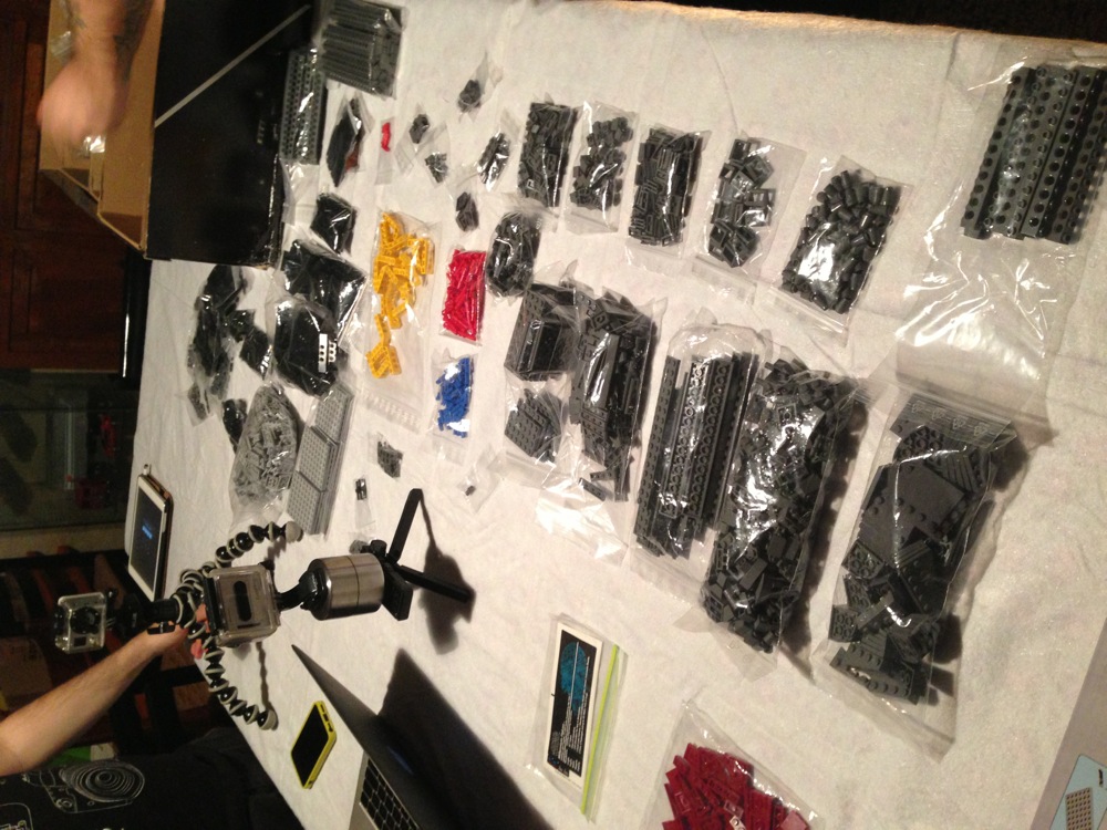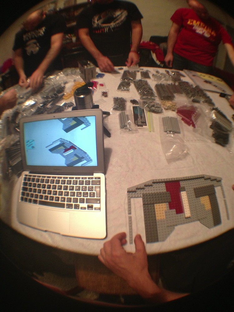 Dovete immaginarvi questa scena: urla dei costruttori che chiedono il tal pezzo, “2×3 mattoncino grigio!”, “6×1 piatto bianco!”, “quattordici technics bucati 10×1!”… Intramezzati dall’inevitabile quanto comico “pezzo a terra!!!”, “pezzo a terra! fermi tutti!”, con conseguente ricerca del mattoncino caduto e “pezzo trovato!” urlato quando la crisi è passata…
