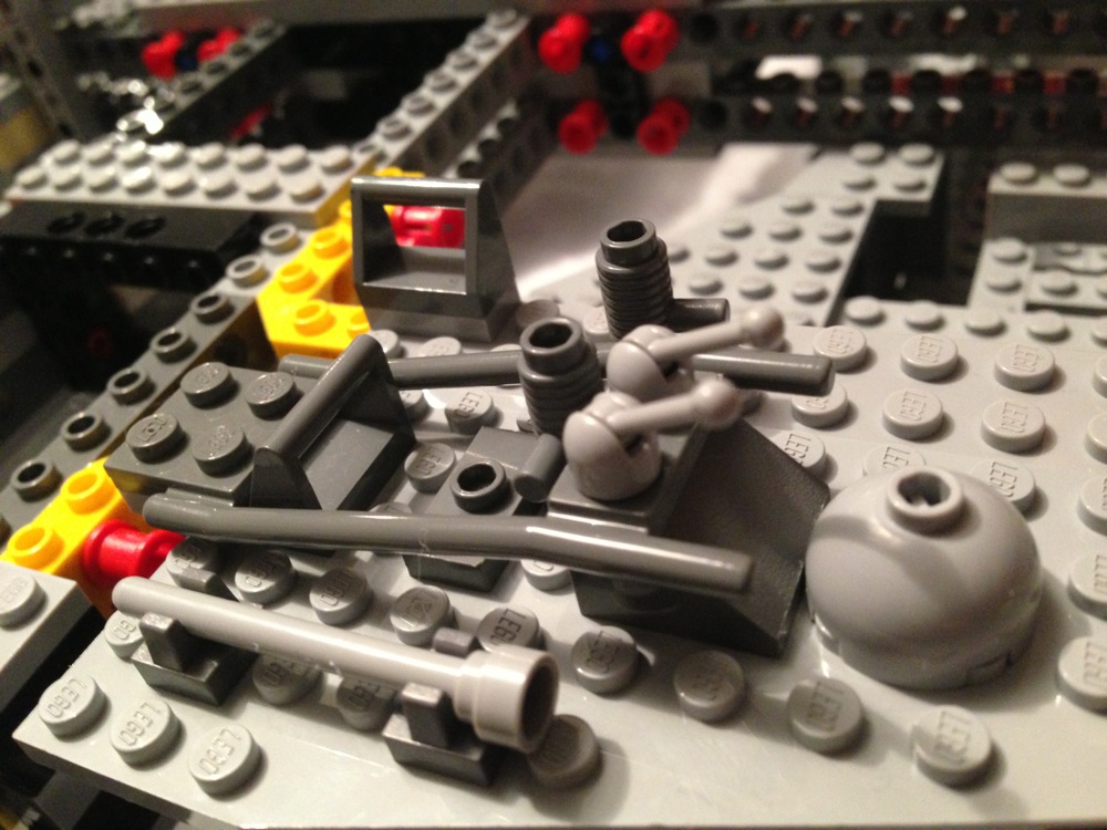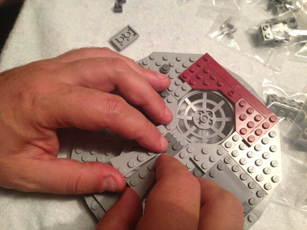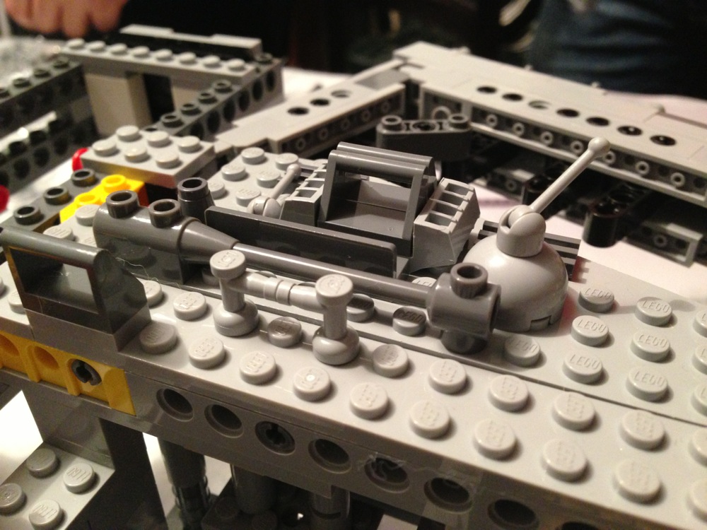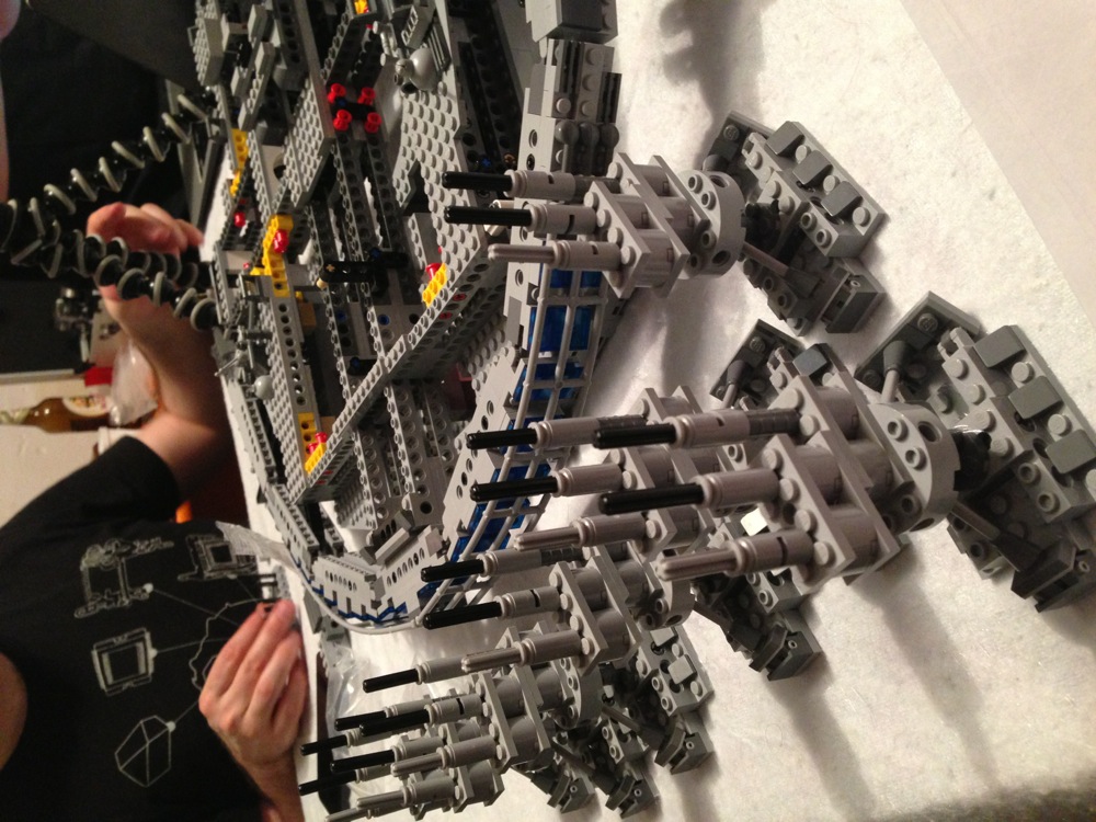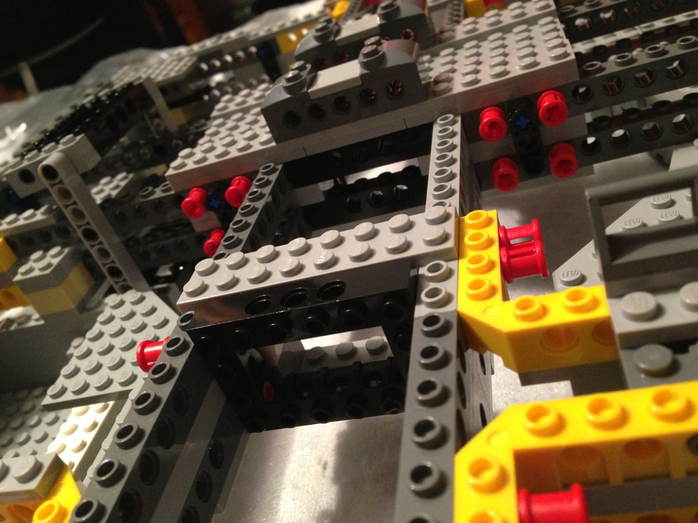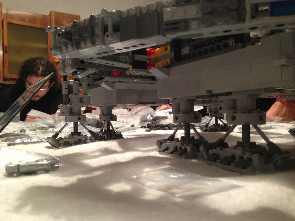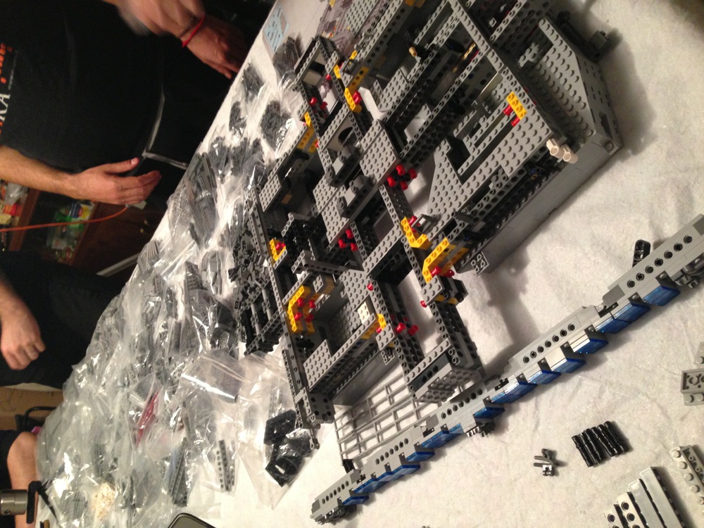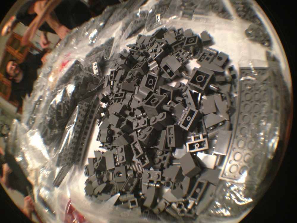 Dovete immaginarvi questa scena: urla dei costruttori che chiedono il tal pezzo, “2×3 mattoncino grigio!”, “6×1 piatto bianco!”, “quattordici technics bucati 10×1!”… Intramezzati dall’inevitabile quanto comico “pezzo a terra!!!”, “pezzo a terra! fermi tutti!”, con conseguente ricerca del mattoncino caduto e “pezzo trovato!” urlato quando la crisi è passata…
