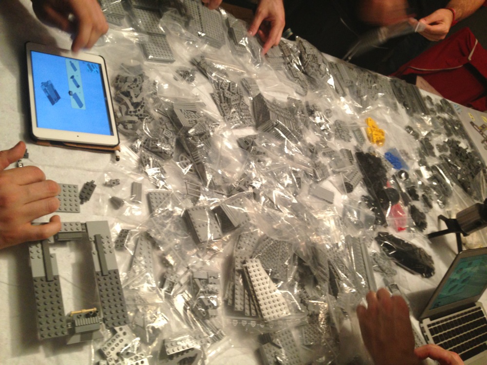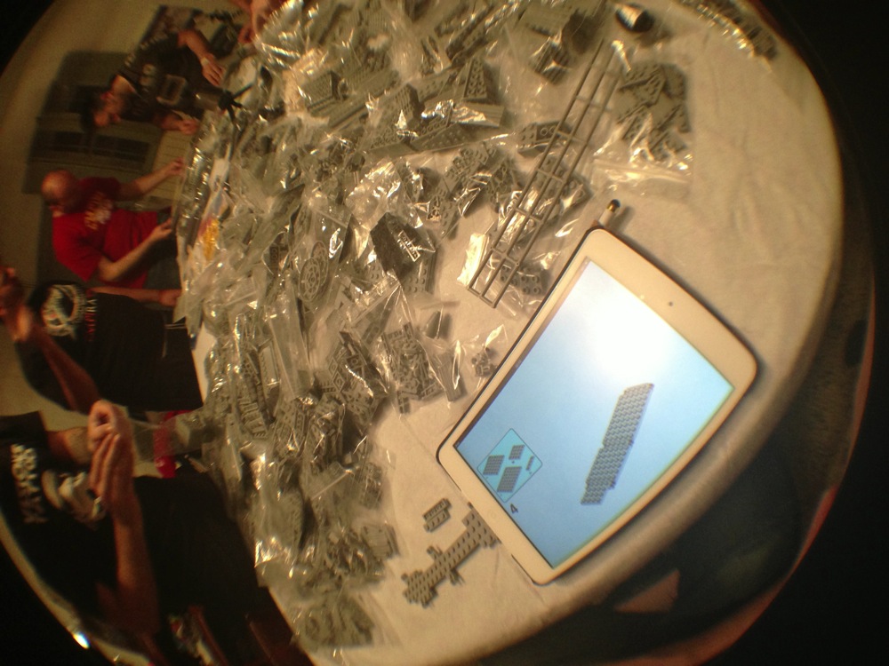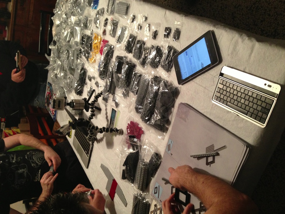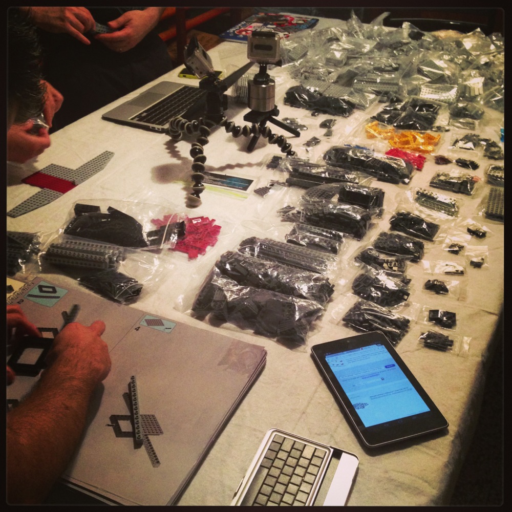 Come dicevo attorno al tavolo avevamo tre costruttori seduti con le istruzioni su vari supporti (tablet, computer e quant’altro) e sei cercatori in piedi a frugare tra i sacchetti per trovare i pezzi che di volta in volta i costruttori chiedevano.