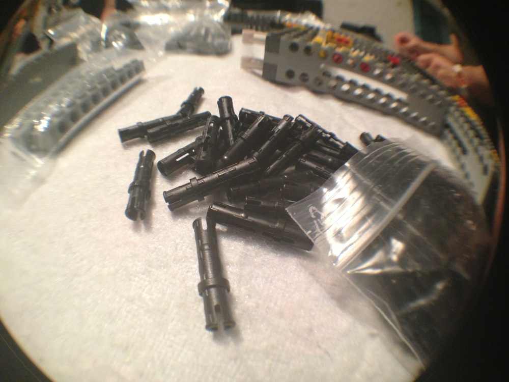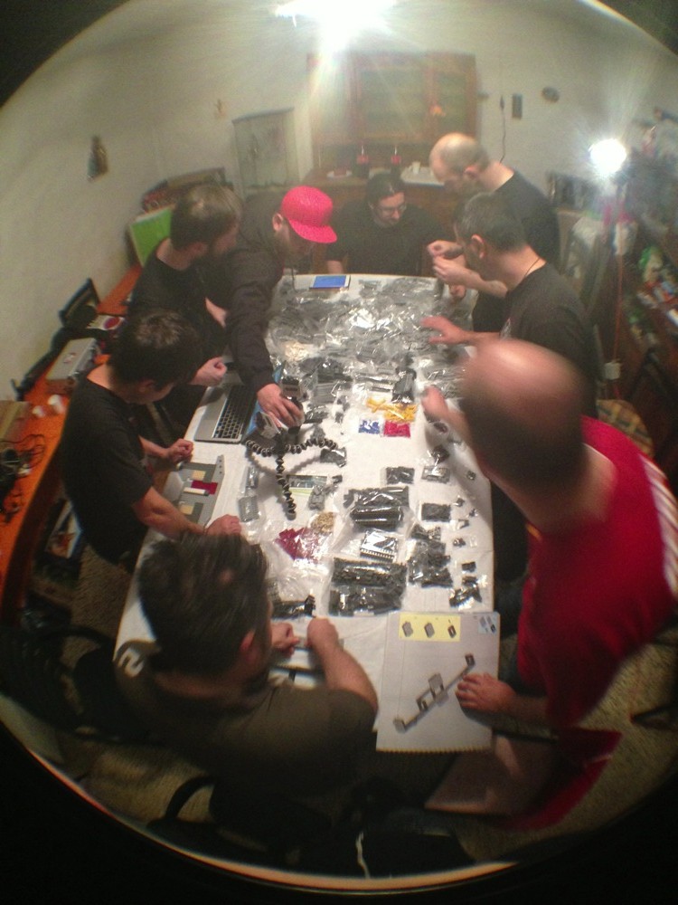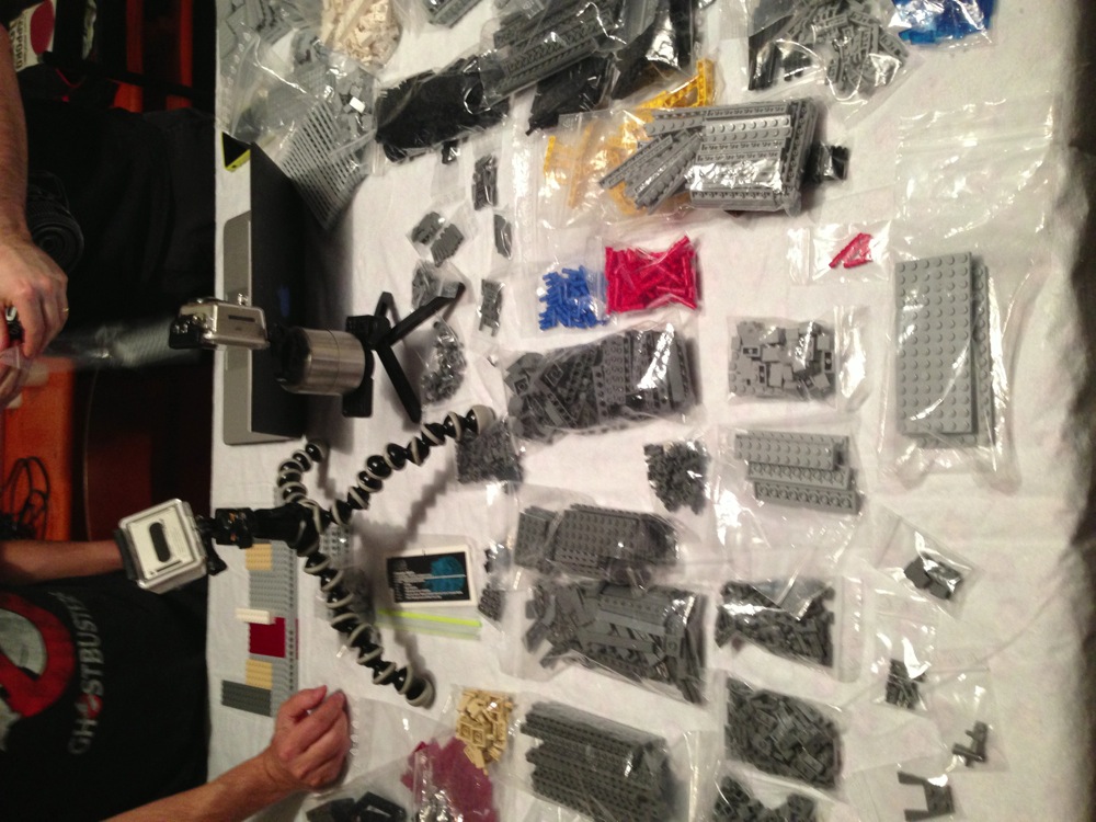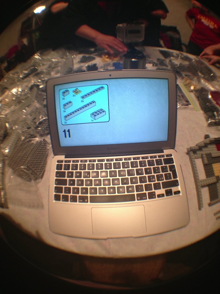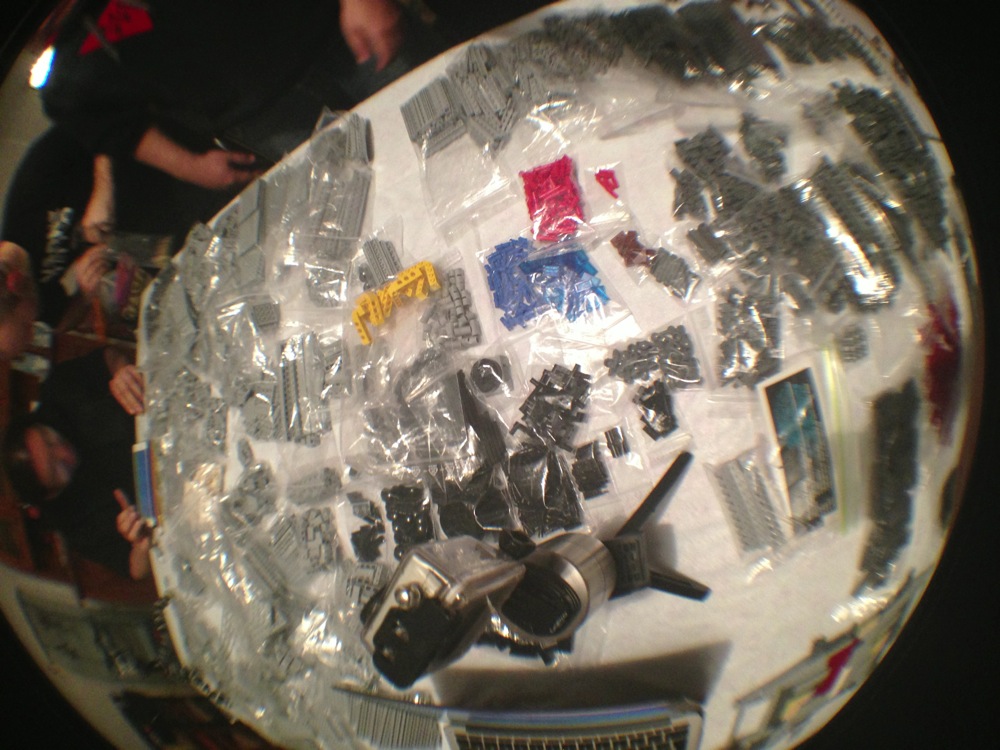 Come dicevo attorno al tavolo avevamo tre costruttori seduti con le istruzioni su vari supporti (tablet, computer e quant’altro) e sei cercatori in piedi a frugare tra i sacchetti per trovare i pezzi che di volta in volta i costruttori chiedevano.
