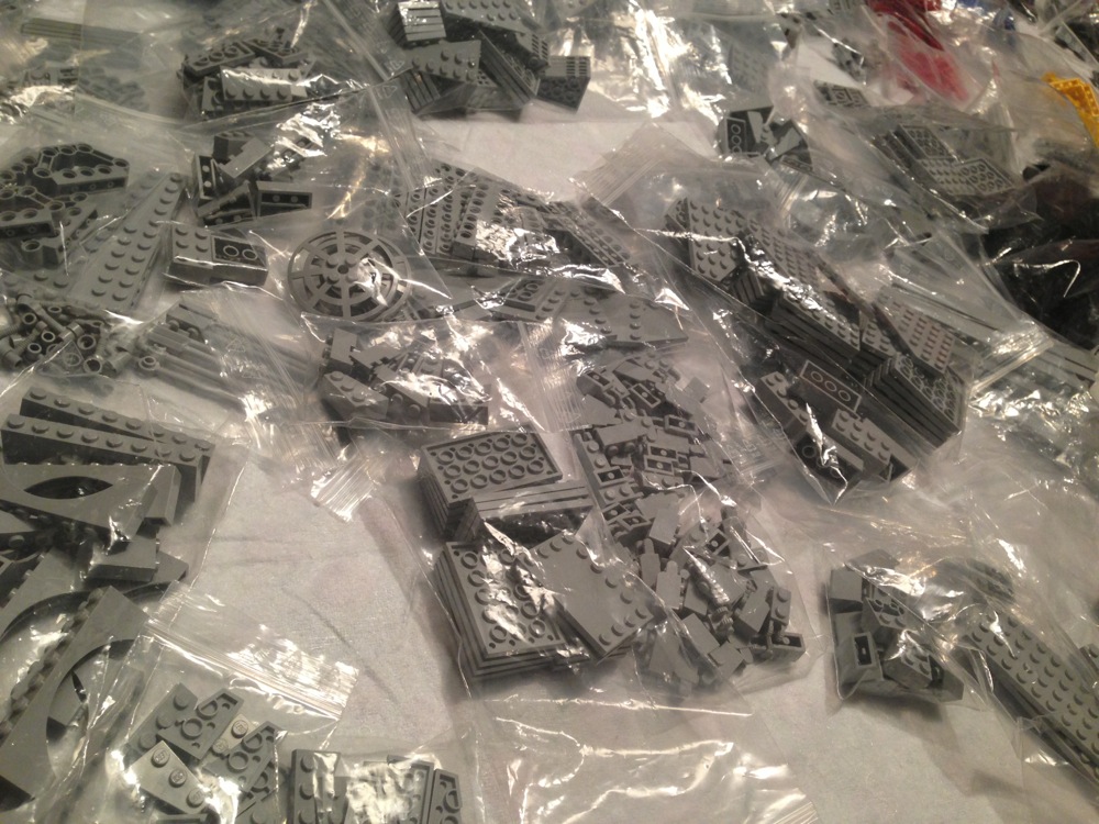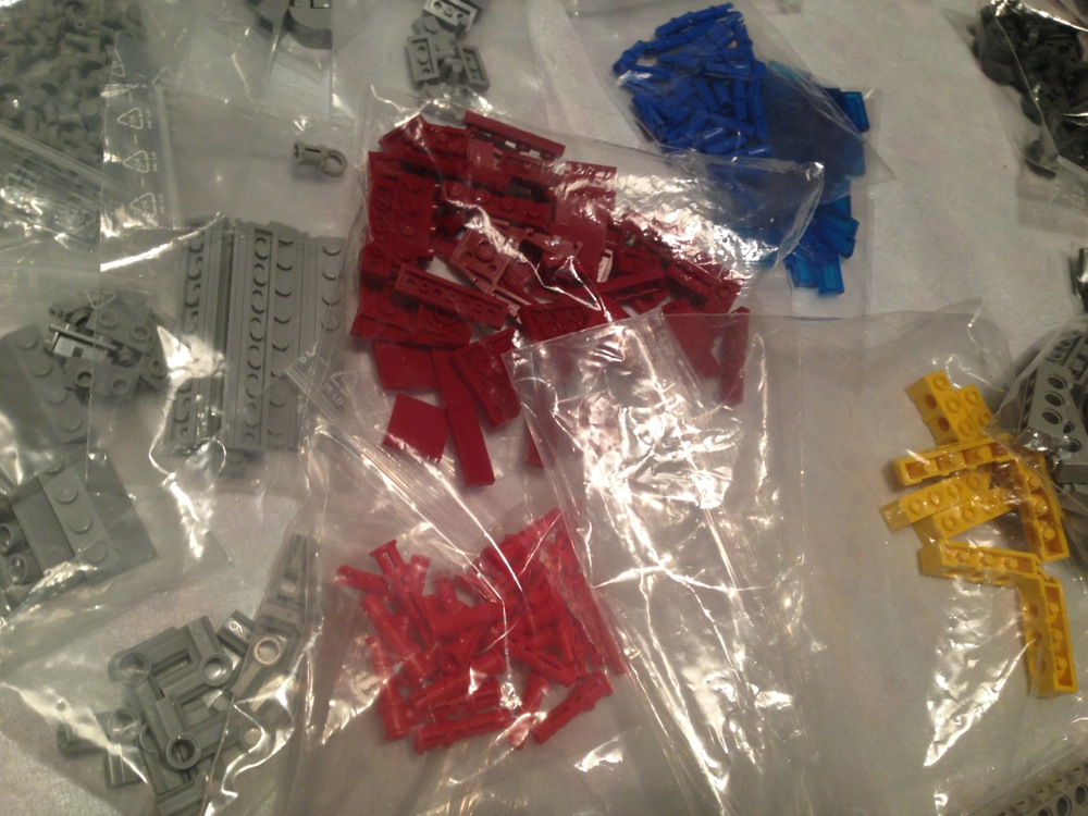 Il tedesco da cui @robyrani ha comprato il set usato ha avuto la gentilezza la germanità di dividere ogni pezzo per tipo, il tutto insacchettato in centinaia di sacchettini di plastica trasparente: questo velocizzerà di molto il nostro lavoro, ma ci aspetta comunque il delirio per svariate ore.