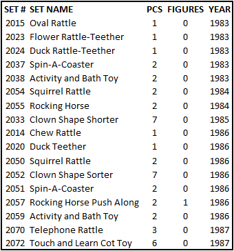 Nel 1987 abbiamo la creazione ufficiale del sottotema Baby, che unisce tipici giocattoli per bambini (come i sonagli) ai tanto amati mattoncini; diversi set verranno retroattivamente considerati parte del sottotema Baby, pur essendo stati prodotti dal 1983 al 1986 semplicemente come Duplo. Il sottotema verrà interrotto nel 1990, per essere poi ripreso dal 2000 al 2005.