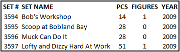 Dedicato al costruttore della serie per bambini della TV inglese, Bob the Builder è stato prodotto dal 2001 al 2009. Qui riporto solo una piccola lista dei set, ma è probabilmente il set su licenza più longevo e nutrito.