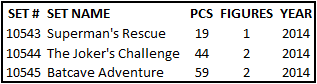 Anche Duplo ha la sua micro-serie dedicata ai supereroi. Sono presenti solo tre set, al momento, uno per Superman e due per Batman.