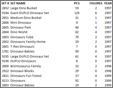 I bambini, si sa, amano i dinosauri. Di conseguenza, dal 1983 al 1997 furono prodotti set del sottotema Dino, ripreso poi nel 2008. I Dinosauri di questi set sono sicuramente molto più adatti ai bambini piccoli rispetto ai classici dinosauri di plastica.