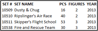Come per Cars, anche Planes vede la sua incarnazione Duplo. Quattro set, prodotti nel 2013.