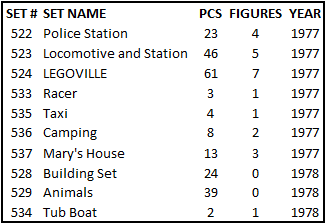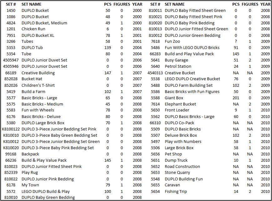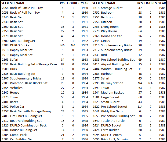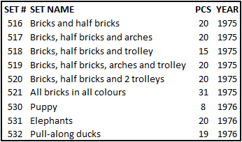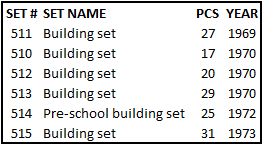 I primi due set per bambini (mirati ai toddlers, cioé ai bambini da uno a due anni), il 510 e 511, appaiono nel 1969, ed includono sia mattoncini standard (2×4), che i primi mattoncini Duplo (anche questi 2×4).