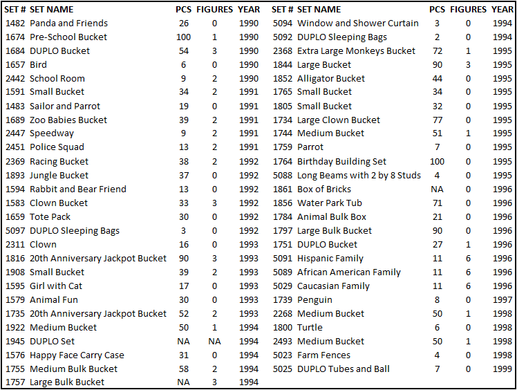Il 1999 vede il primo licensing per Duplo. Vengono prodotti ben 7 set dedicati all’orsacchiotto di pezza, ed il sottotema ne vedrà altrettanti nel 2001, ed altri tre nel 2011.