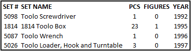 Il sottotema Toolo è fondamentalmente il Meccano della Duplo. Introduce alcuni attrezzi per montare e smontare i pezzi (viti, cacciavite). Fu prodotto dal 1992 al 1993, poi ripreso dal 1995 al 2000. Non ho trovato una lista completa dei set, purtroppo.
