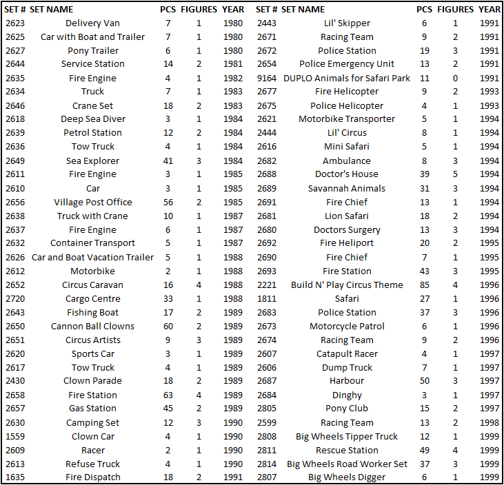Gli anni ’80 e ’90 segnano un periodo di trasformazione ed espansione del tema Duplo, e l’introduzione di tanti set, da quelli contenenti solo mattoncini, a quelli che includono anche le figures. Abbiamo anche i primi sottotemi all’interno del tema Duplo.