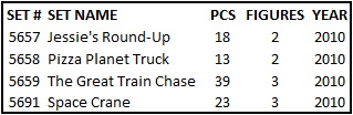 Altro licensing dalla fortunata serie Pixar, Toy Story è stato prodotto nel 2010, purtroppo composto al momento di soli 4 set.
