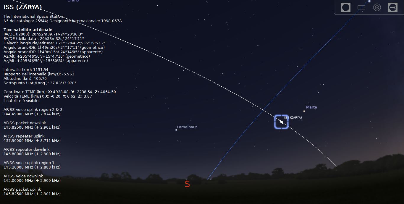 Rivolgiamoci verso Sud-Ovest come suggerito dalla tabella precedente… se avete fatto tutto bene, dovreste veder spuntare la nostra ISS e cliccandoci sopra potrete avere maggiori informazioni sull’oggetto (per esempio, Zarya è il nome del primo modulo messo in orbita nel 1998). Notate anche come passerà vicino a Marte: