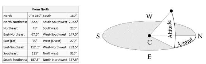 - Azim: è l’angolo di azimut (vedi figure) riportato utilizzando i punti cardinali.