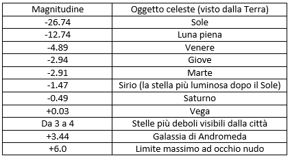 Come vedete dalla tabella precedente, salta subito all’occhio una stranezza. Infatti corpi celesti luminosi come il Sole e la Luna sono caratterizzati da una magnitudine negativa mentre gli oggetti più deboli si trovano a magnitudini maggiori.
