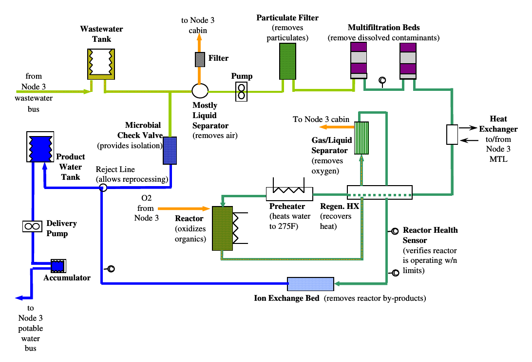 Nel Wastewater Tank vengono convogliate le acque di scarto, la condensa recuperata dal Temperature and Humidity control System e il distillato dall’UPA . Un compressore tiene la pressione costante tra i 5,2 e 15,5 kPa necessaria a spingerne il contenuto nel Mostly Liquid Seperator dove i gas vengono separati dall’acqua .